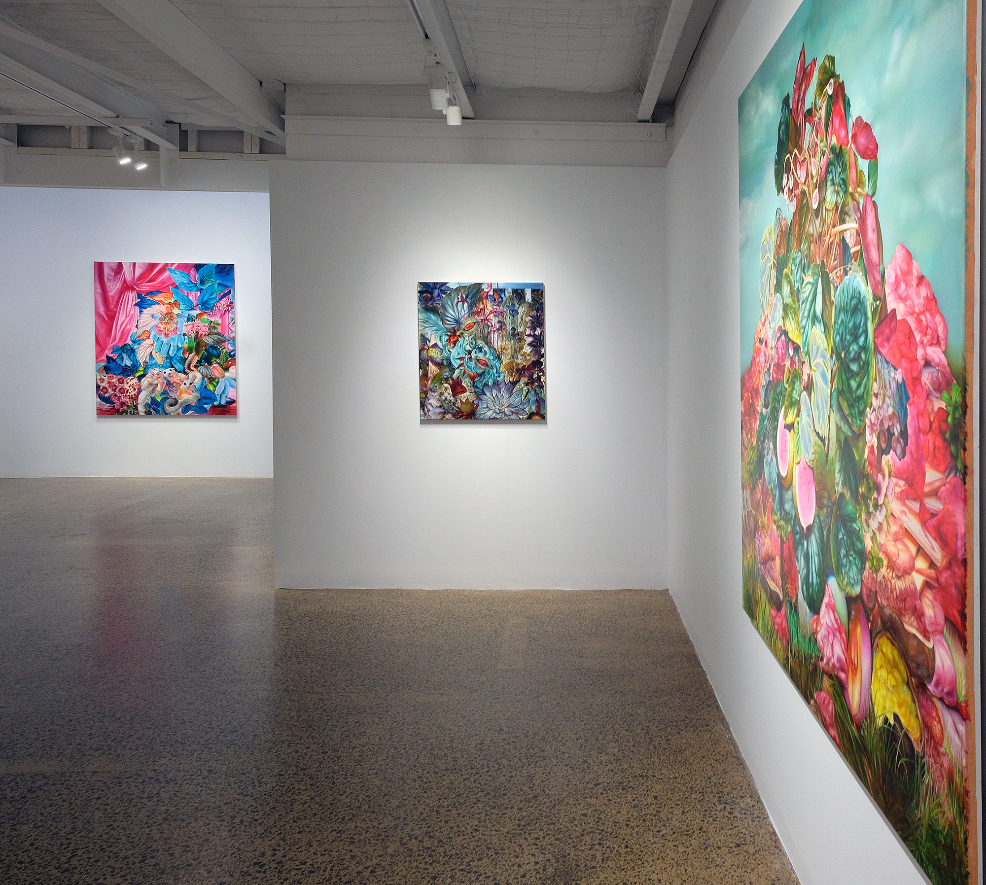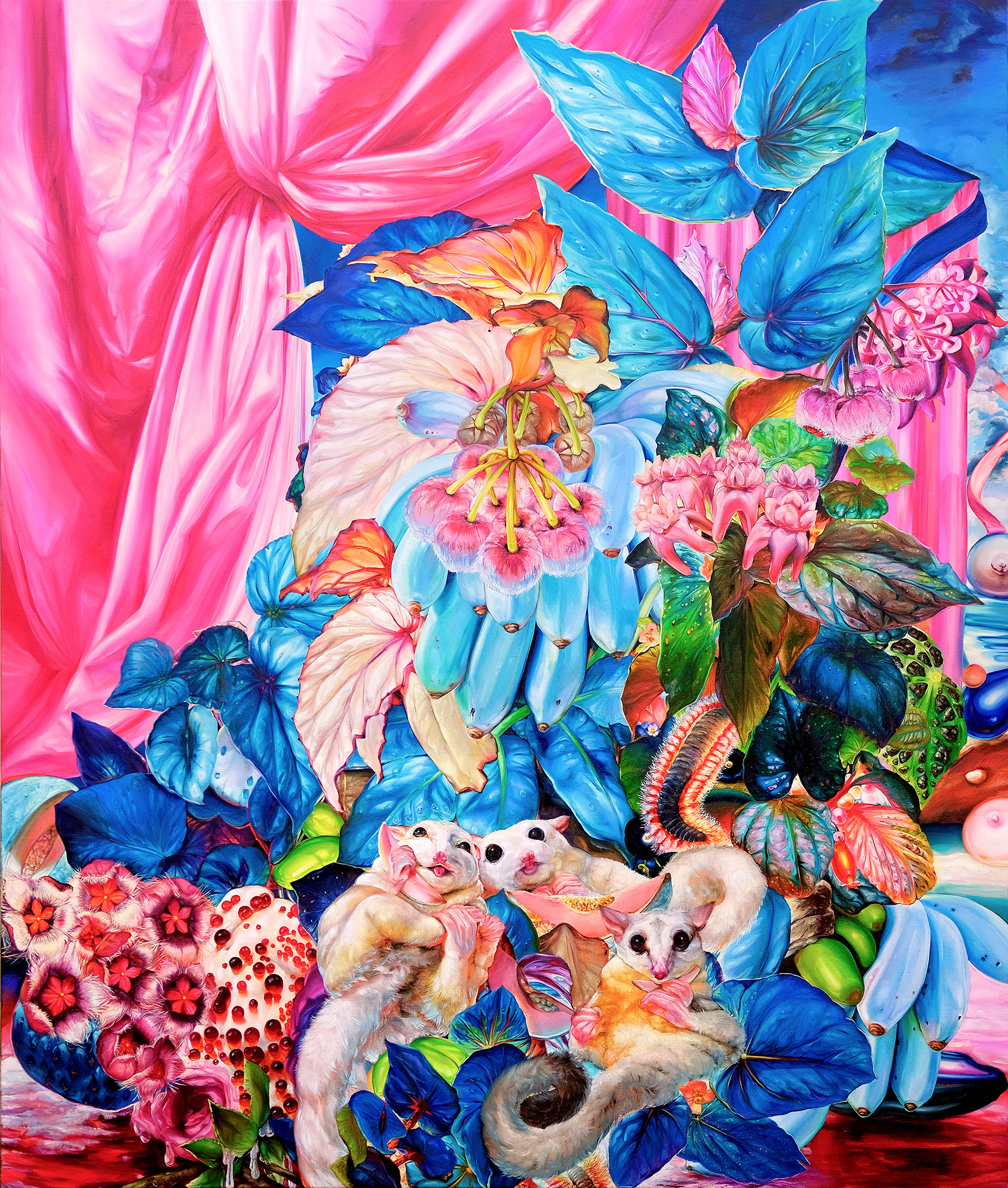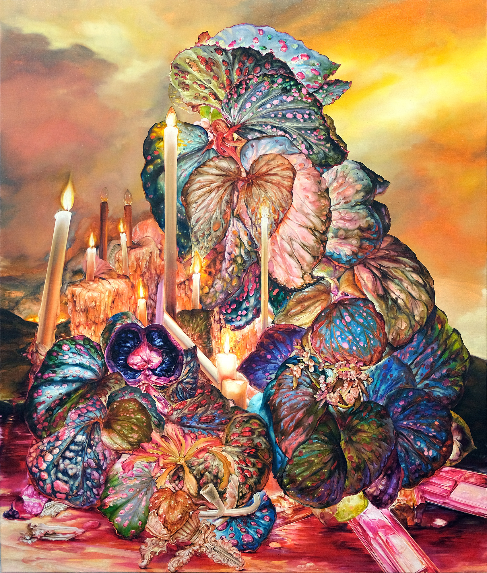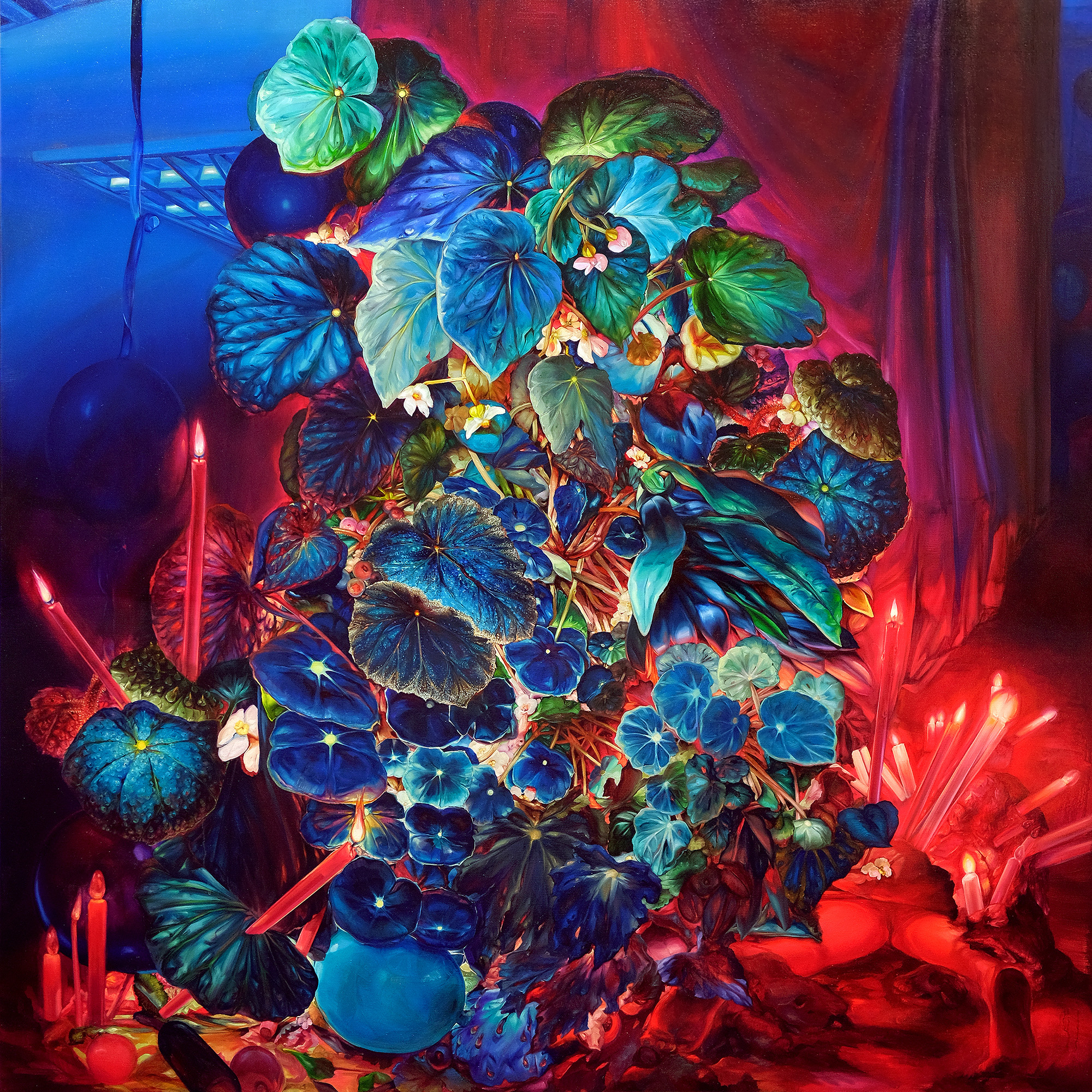 In hyperreal, luxuriously maximalist scenes, flora and party paraphernalia are depicted in a neo-Rococo celebration of excess and revelry. Iridescent textures gleam like mirror balls; branches sway like dancers on the floor. But all that glitters is not gold.
