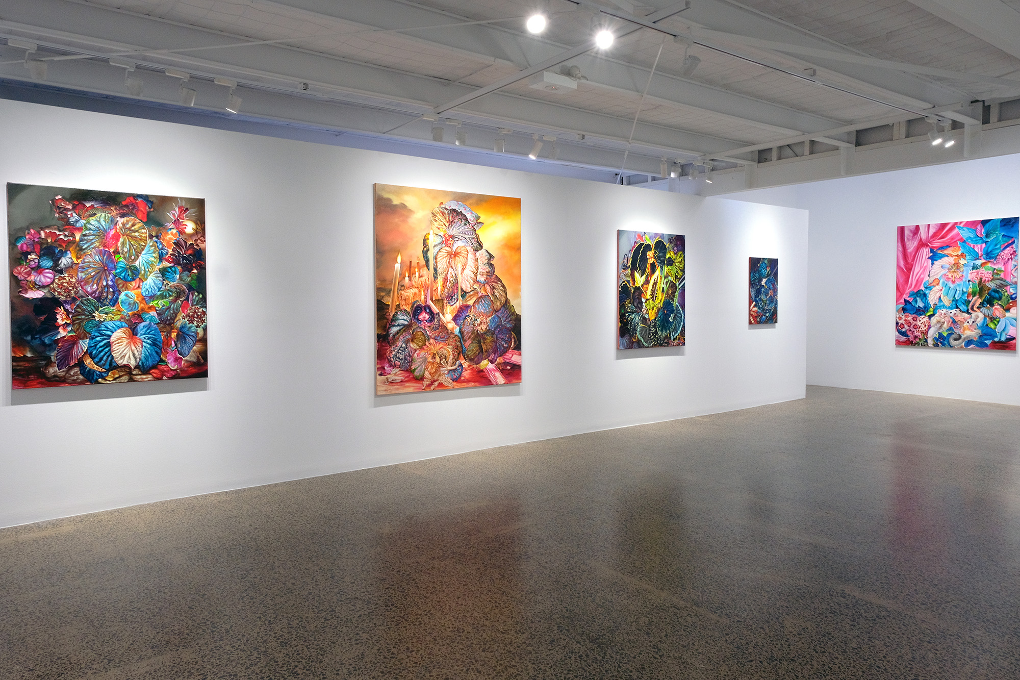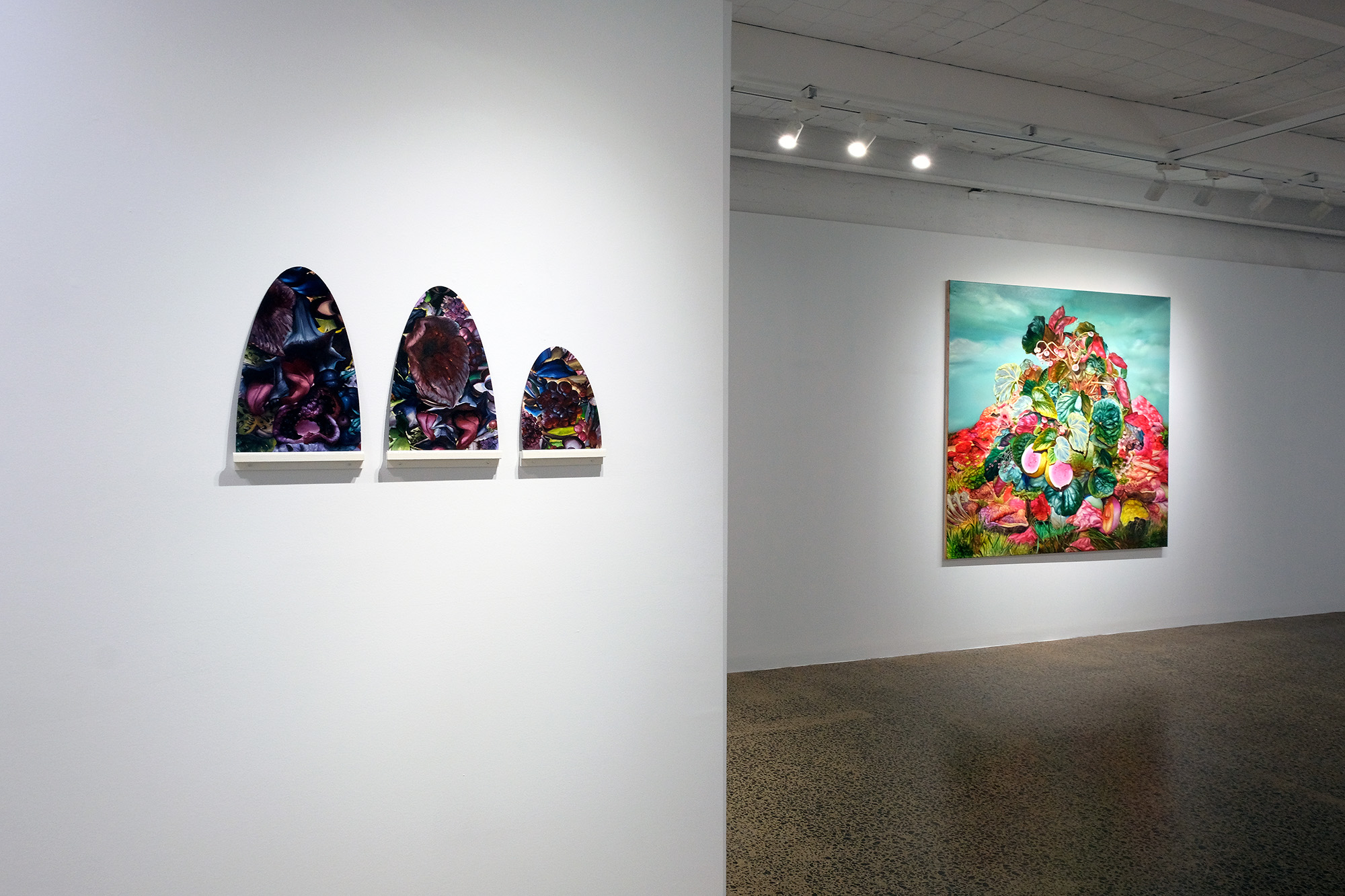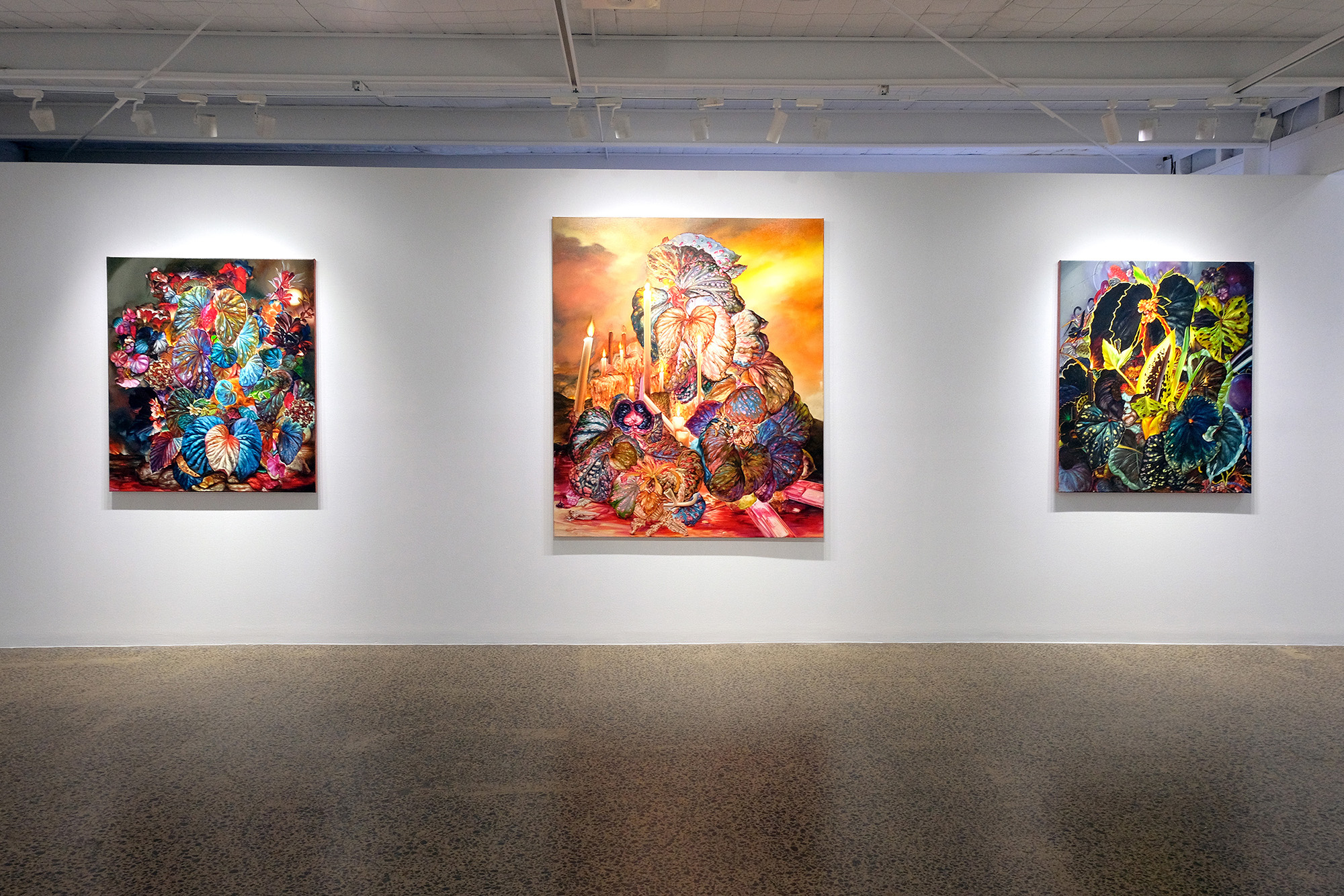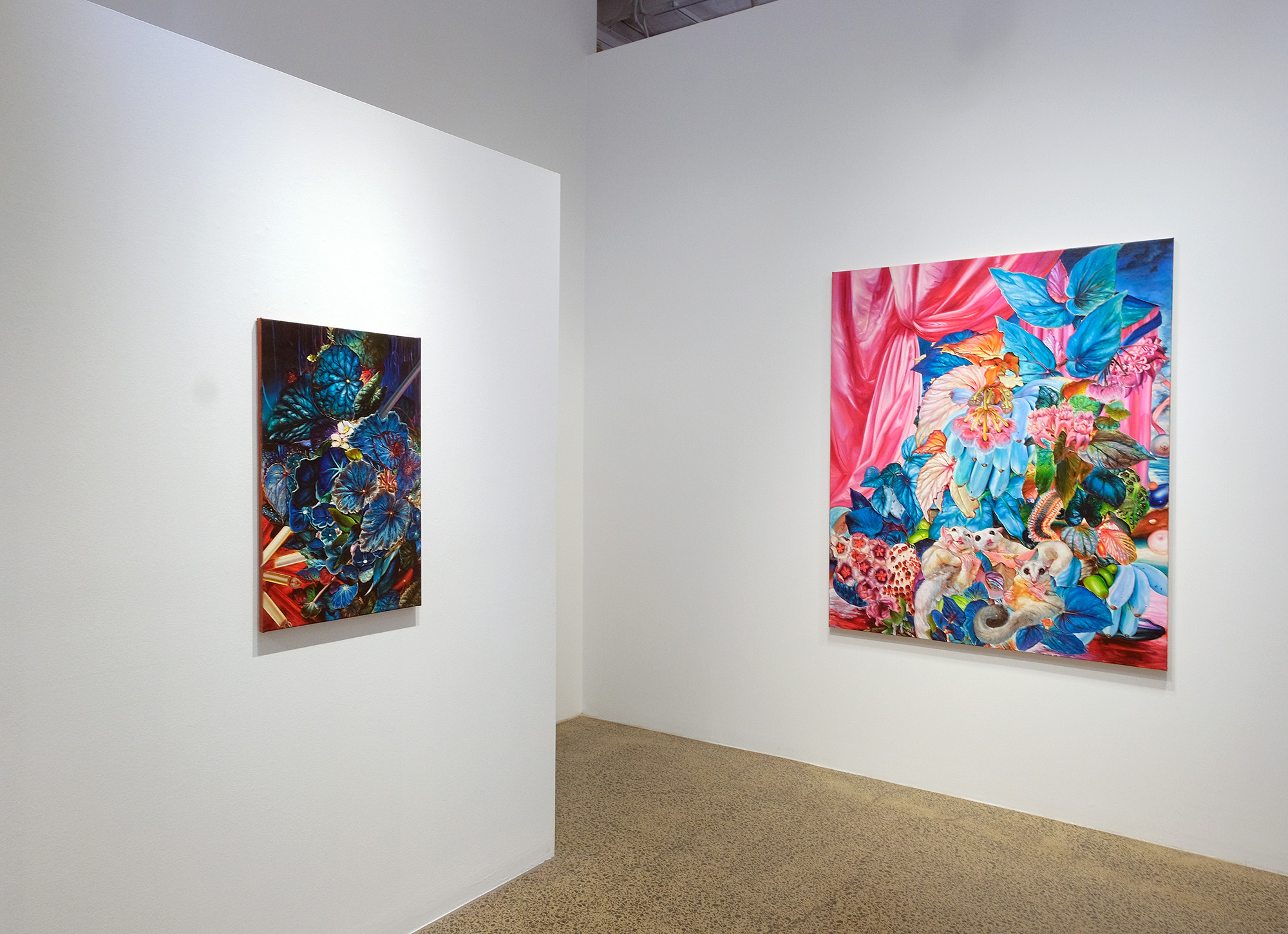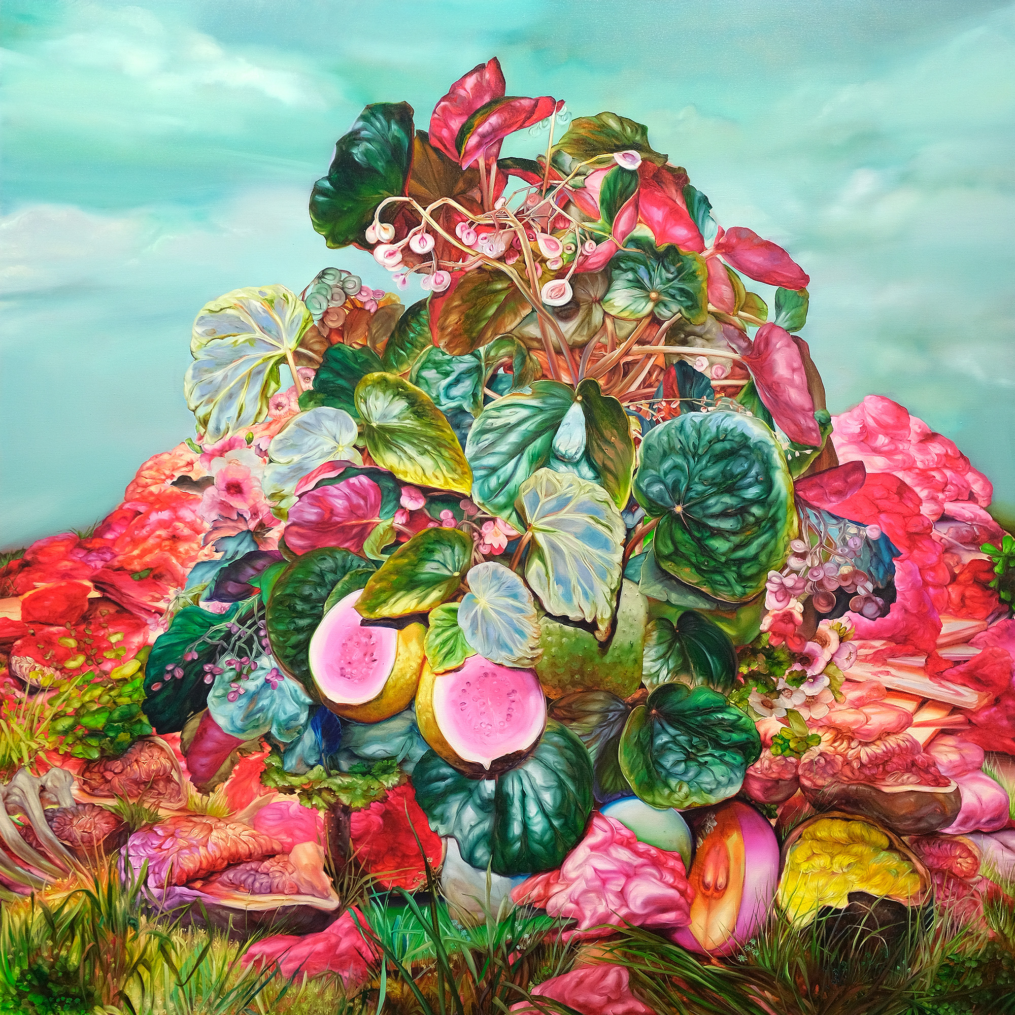 In hyperreal, luxuriously maximalist scenes, flora and party paraphernalia are depicted in a neo-Rococo celebration of excess and revelry. Iridescent textures gleam like mirror balls; branches sway like dancers on the floor. But all that glitters is not gold.