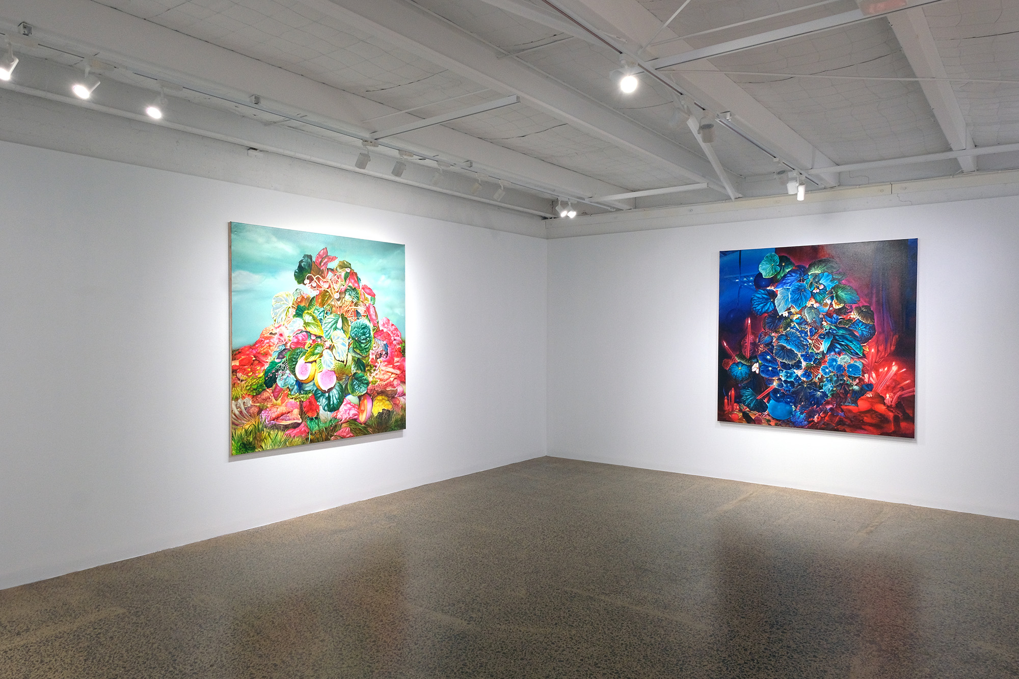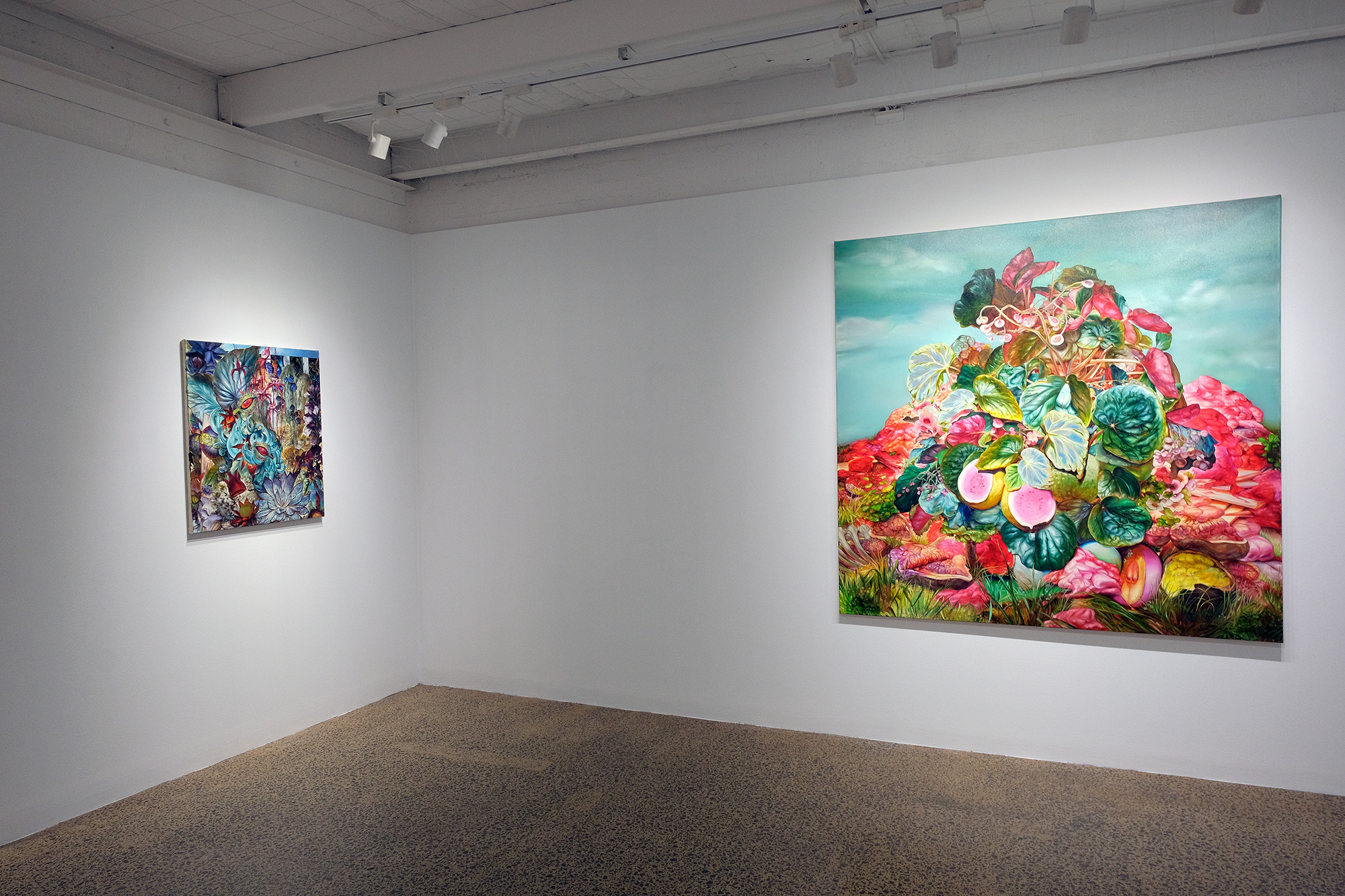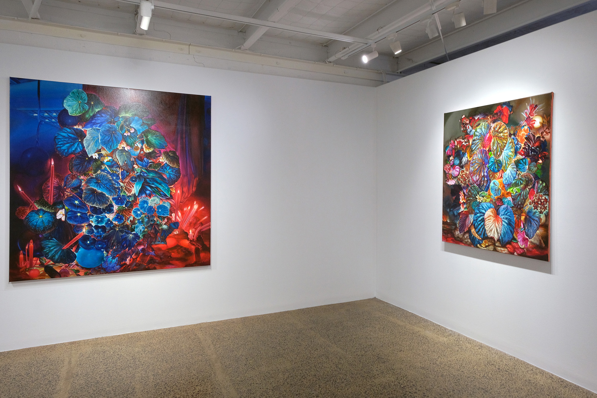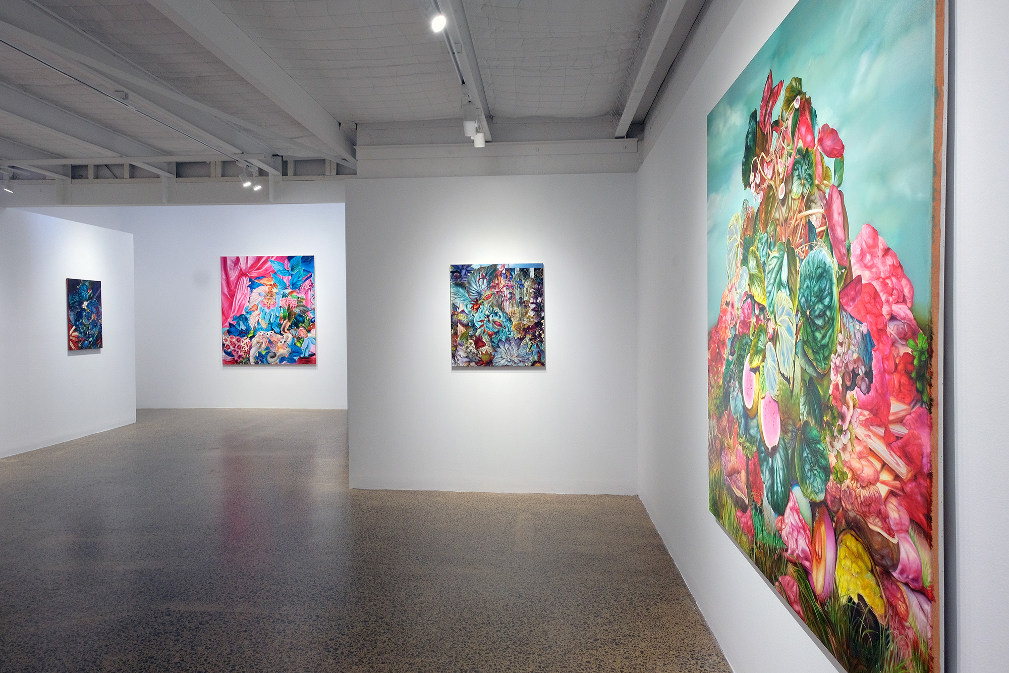 In hyperreal, luxuriously maximalist scenes, flora and party paraphernalia are depicted in a neo-Rococo celebration of excess and revelry. Iridescent textures gleam like mirror balls; branches sway like dancers on the floor. But all that glitters is not gold.