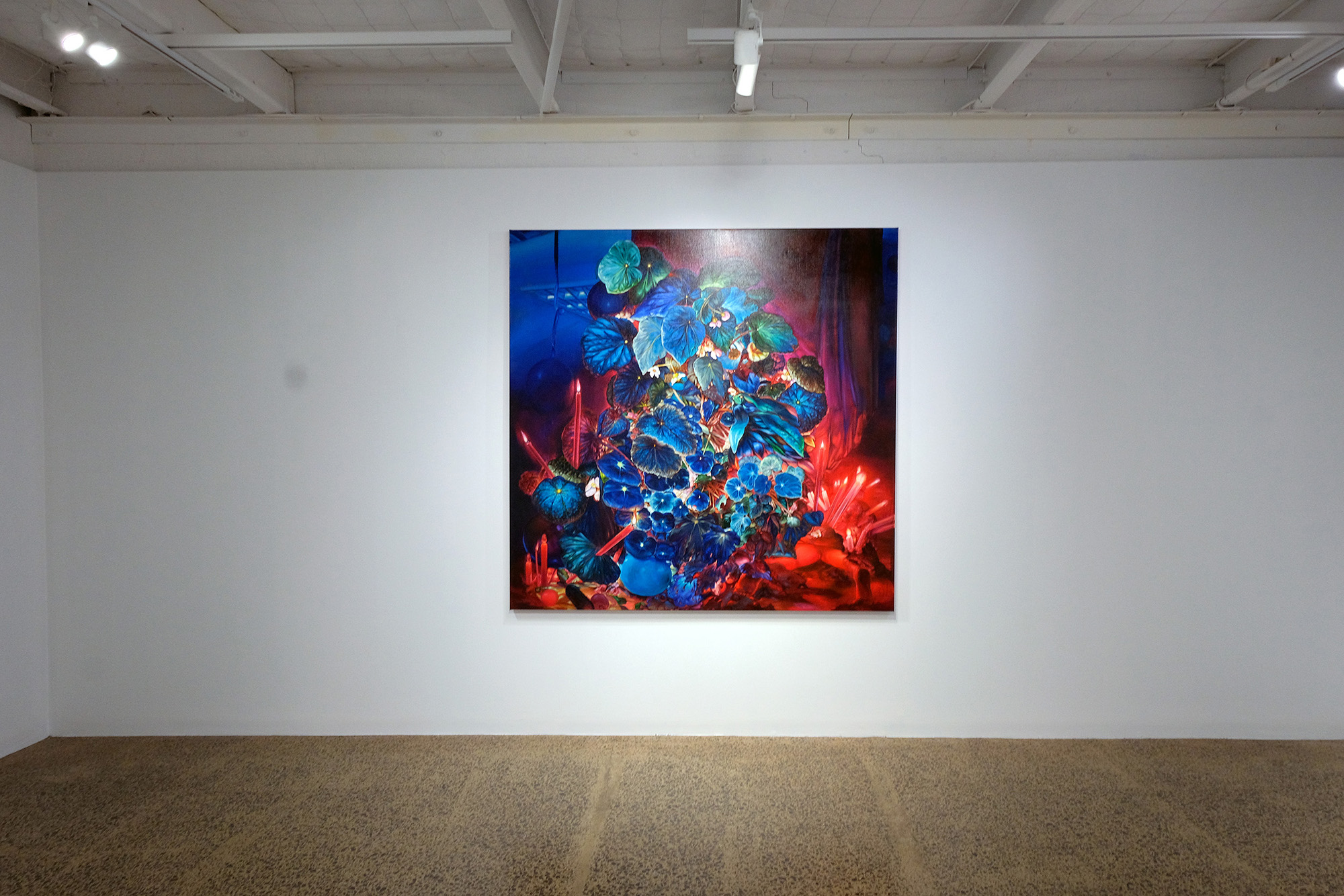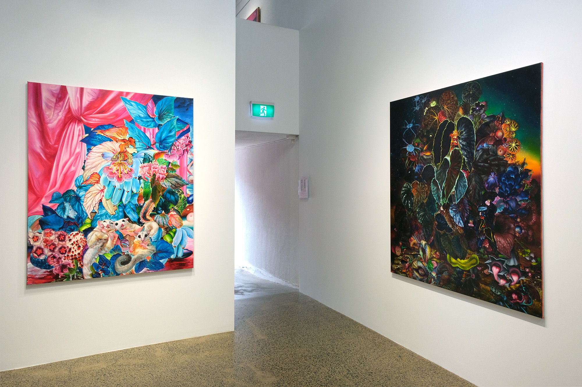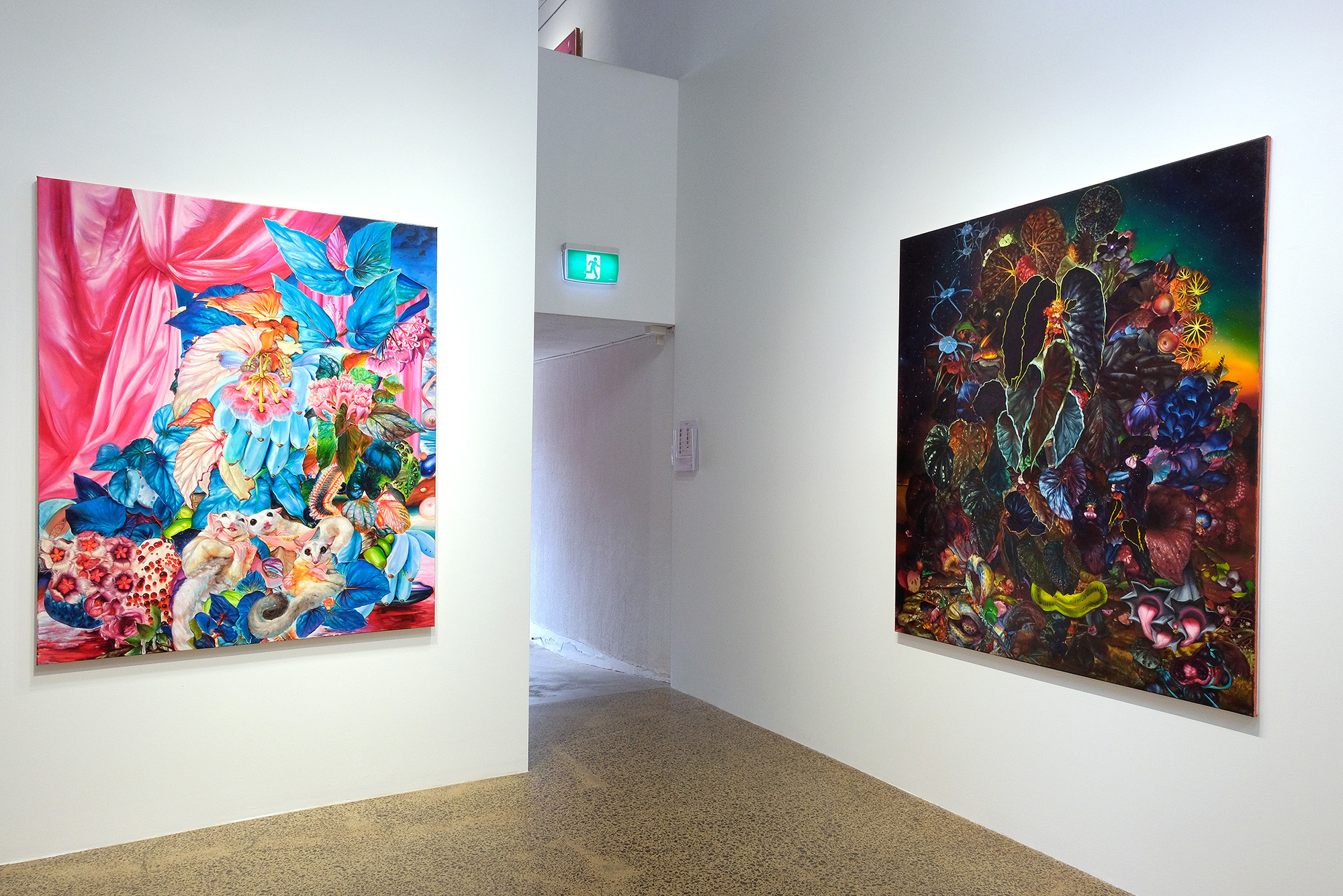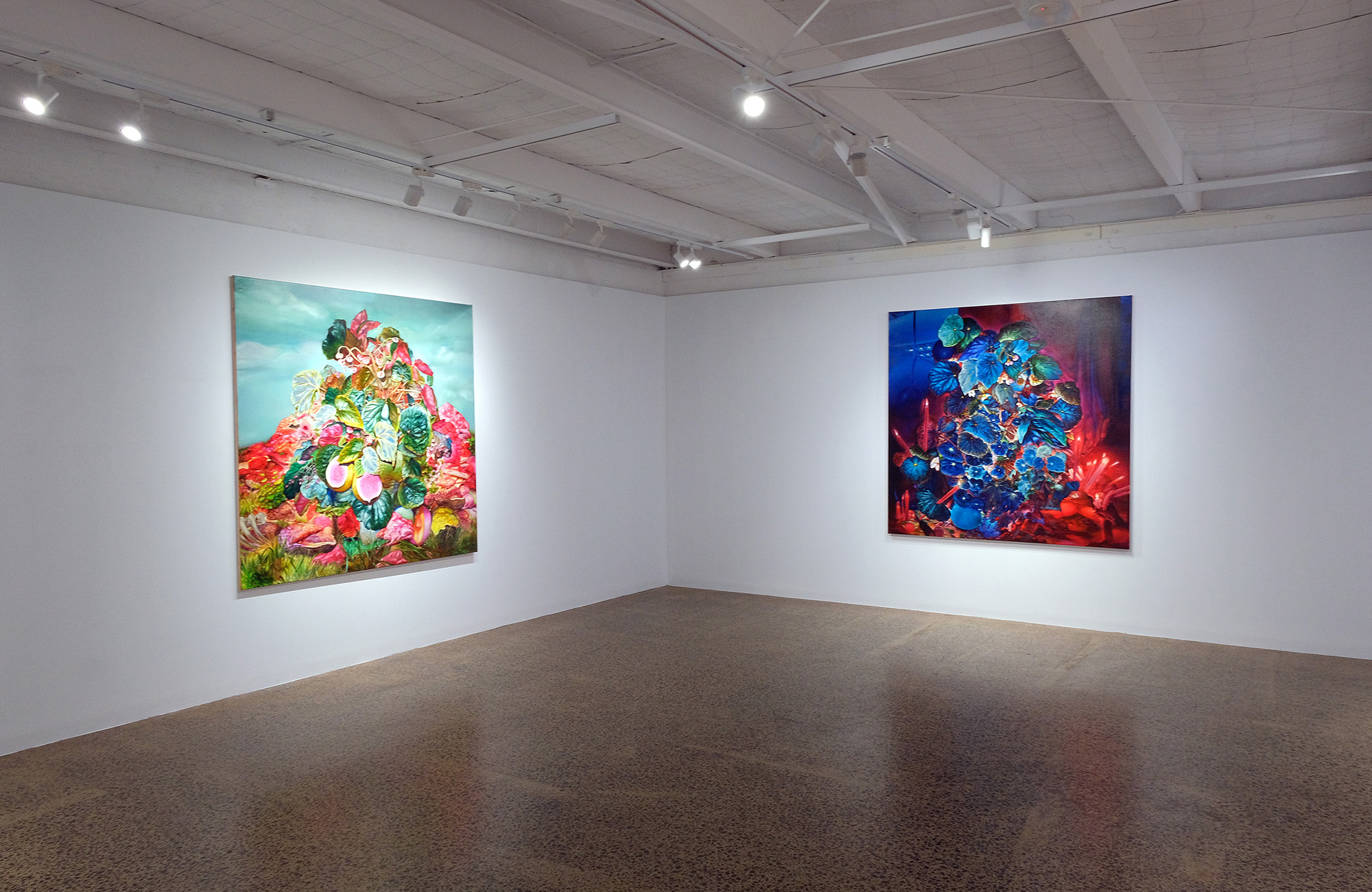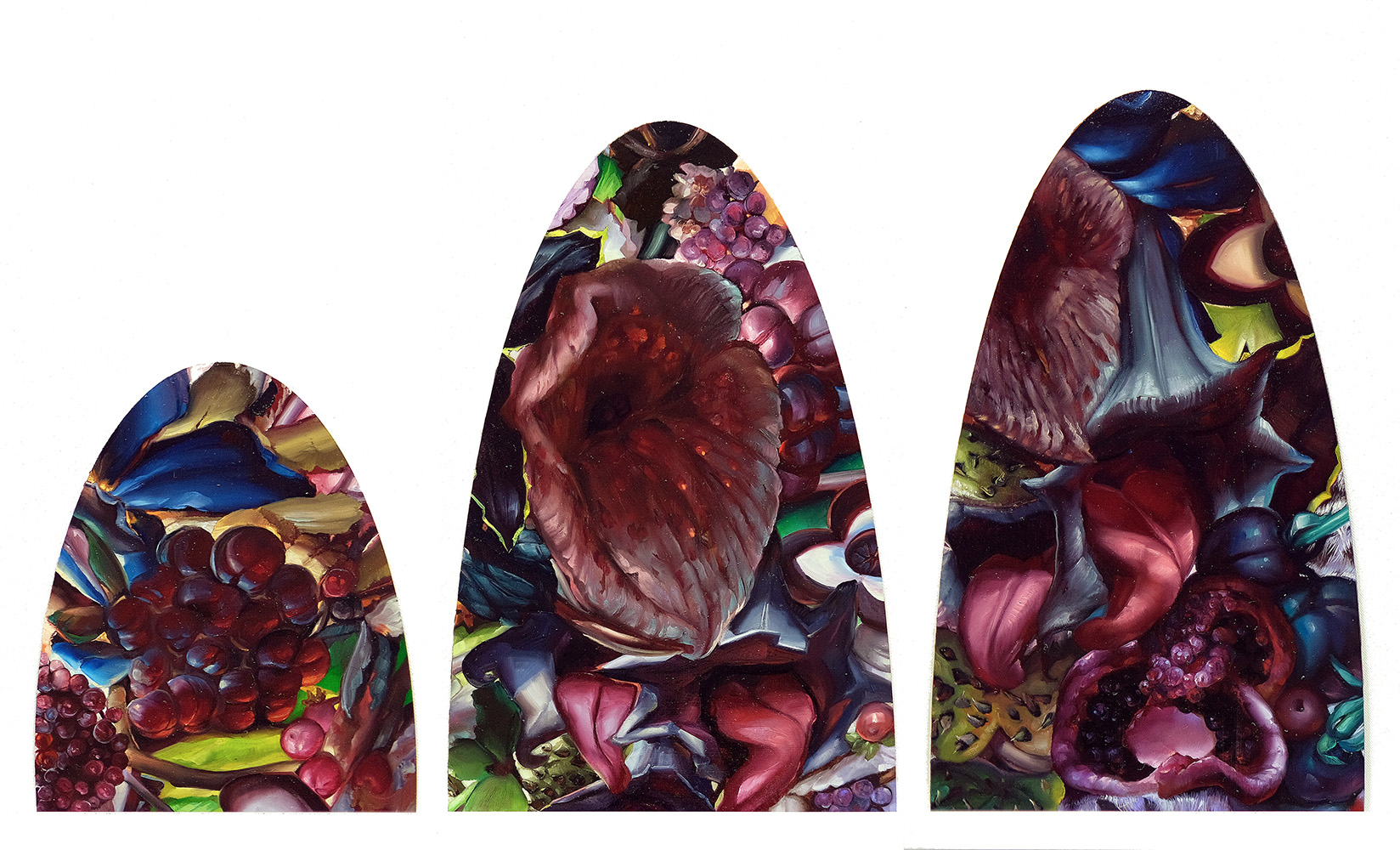In hyperreal, luxuriously maximalist scenes, flora and party paraphernalia are depicted in a neo-Rococo celebration of excess and revelry. Iridescent textures gleam like mirror balls; branches sway like dancers on the floor. But all that glitters is not gold.