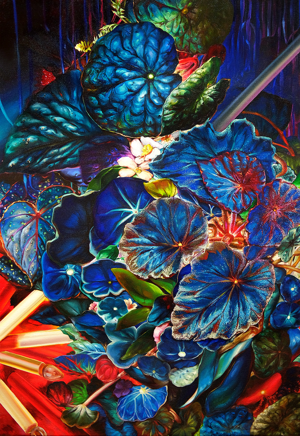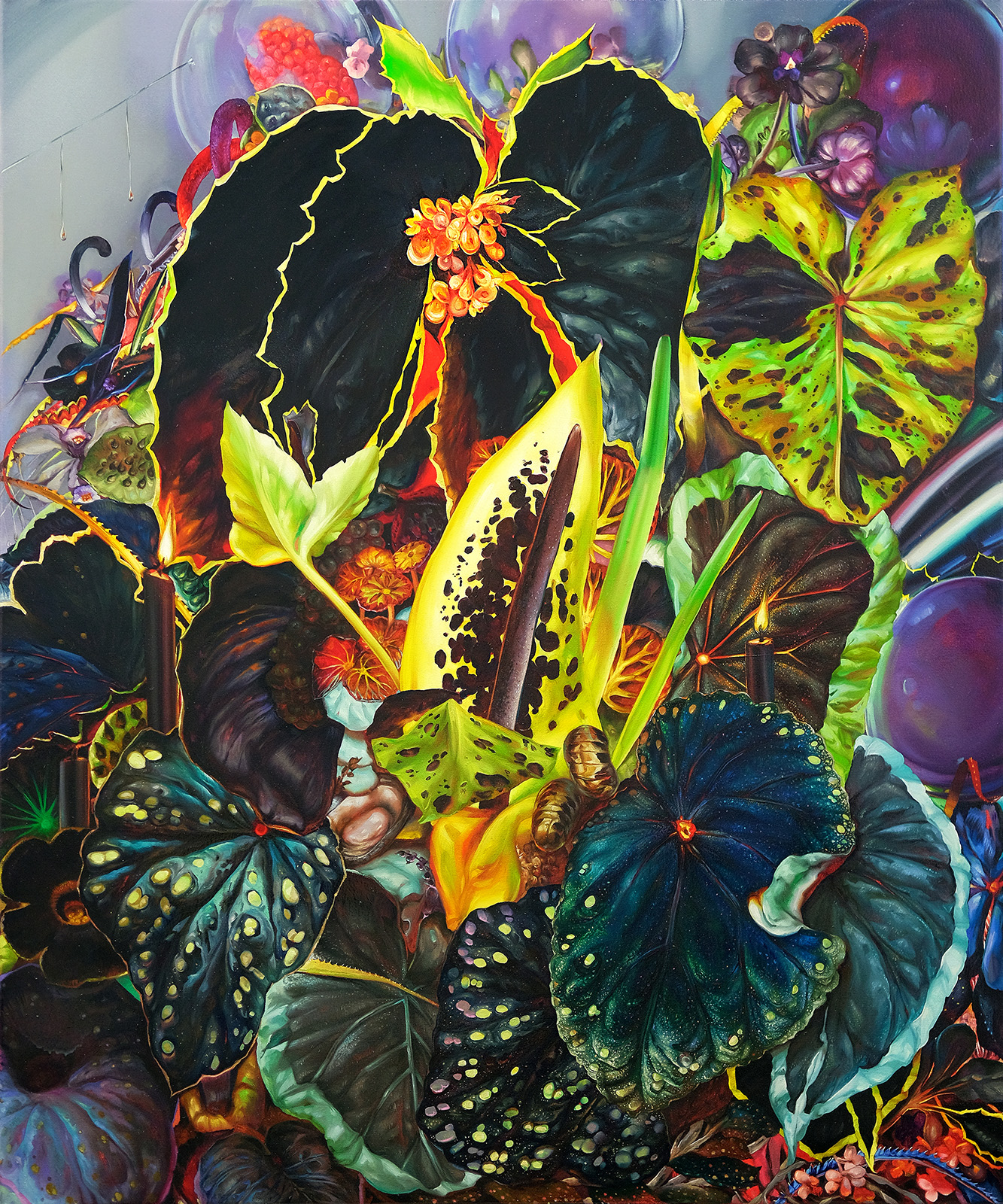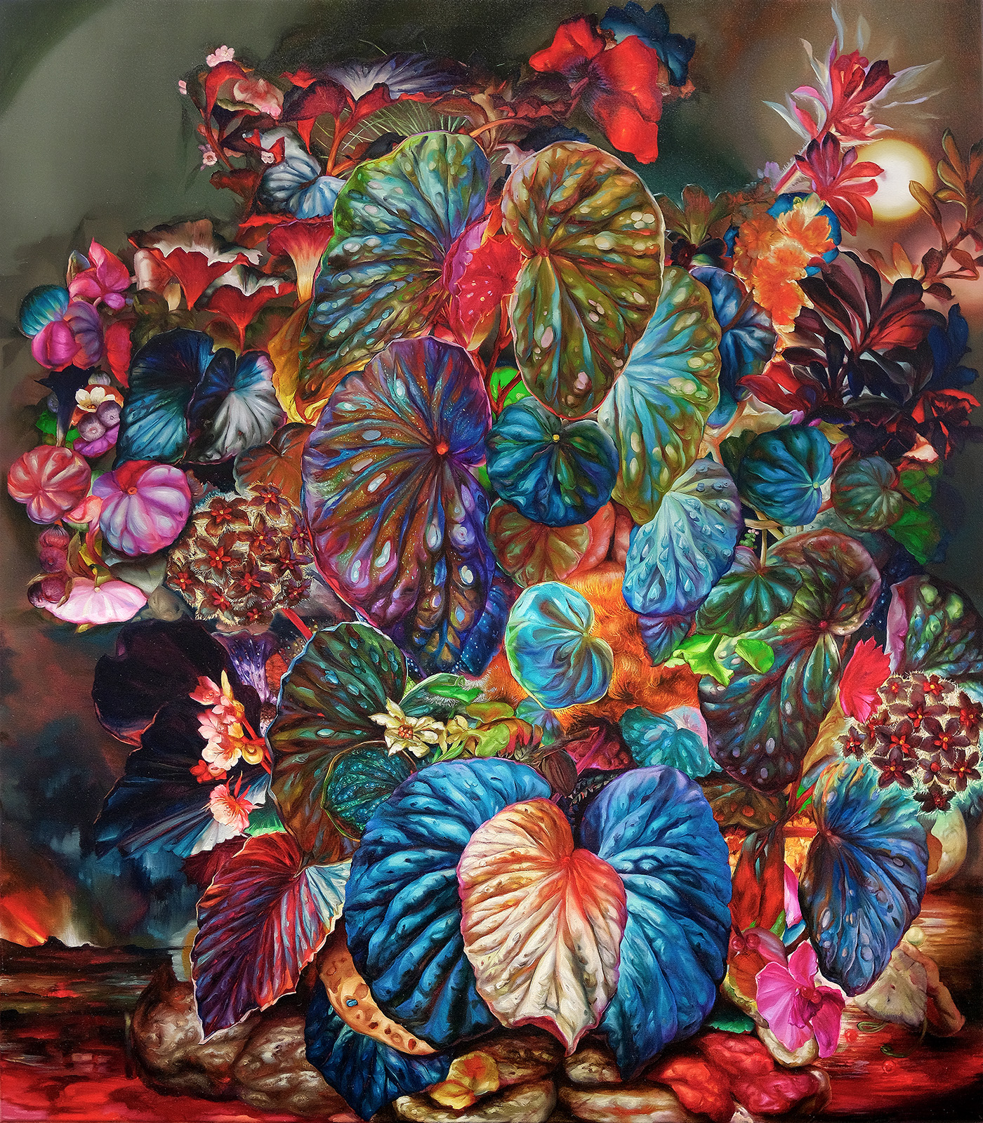 Shimmering Begonia leaves pile high—striated, variegated, polka-dotted, and waxed. Luxurians and Angel Wings stretch heavenward as an offering to the gods. A surreptitious bowerbird tirelessly adds to the Bacchanalian scene with evermore trinkets and fruit.