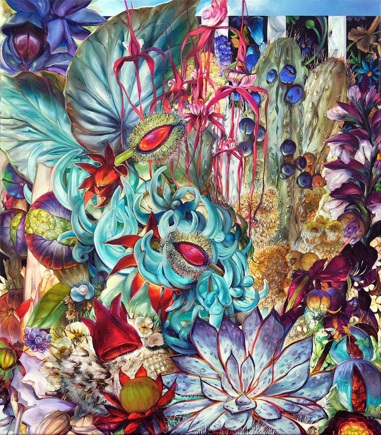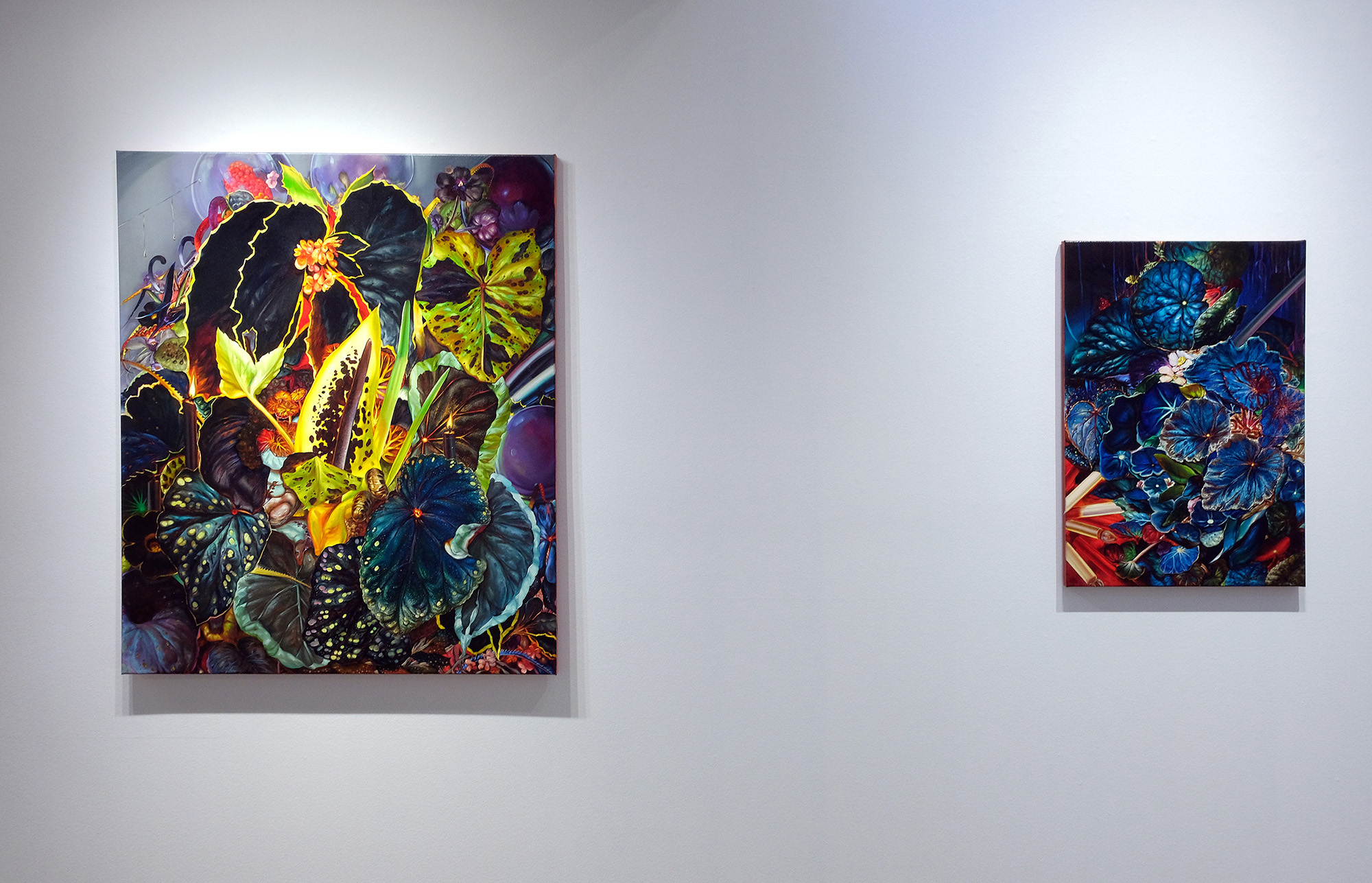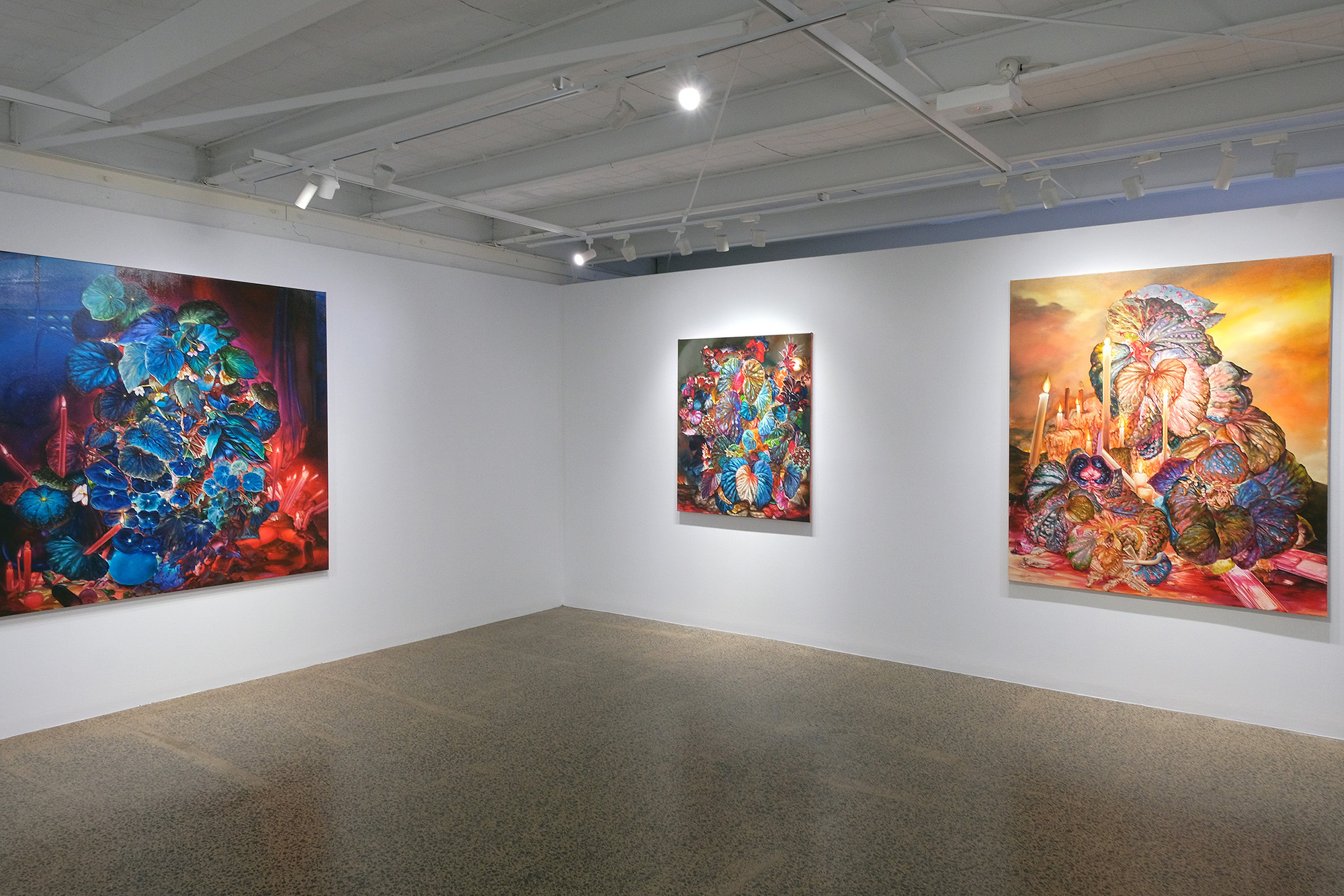 Shimmering Begonia leaves pile high—striated, variegated, polka-dotted, and waxed. Luxurians and Angel Wings stretch heavenward as an offering to the gods. A surreptitious bowerbird tirelessly adds to the Bacchanalian scene with evermore trinkets and fruit.