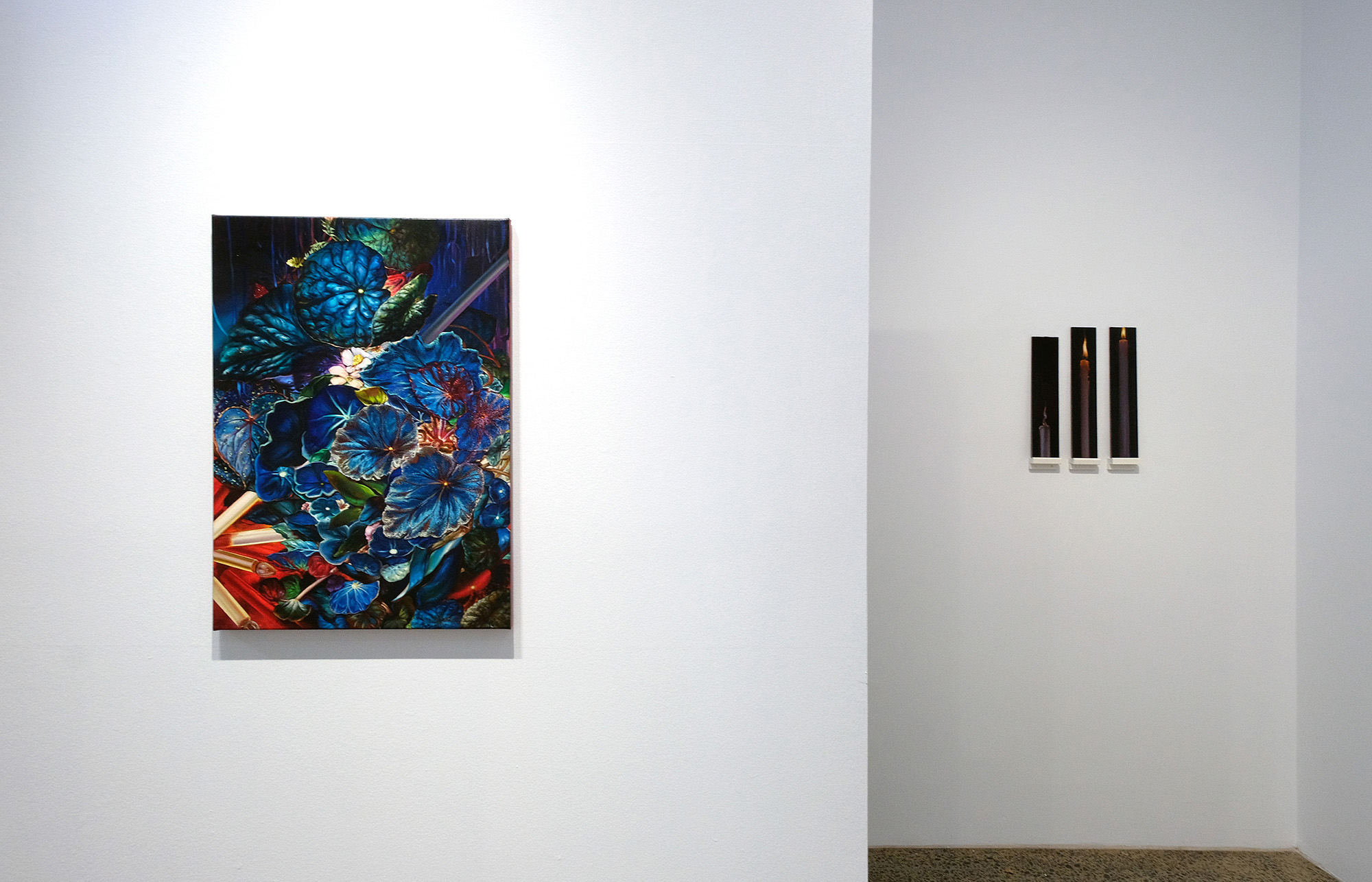 With an air of affirmative nihilism and tragicomic melodrama, Marchesi’s paintings depict complex entanglements of multigenus flora in hypernatural, posthumanist scenes. Positioned between seduction and repulsion, her botanical subjects operate as potent allegories—sensuous yet critical, underscoring the duality of human nature. Where vanitas still lifes once used cut flowers, burning candles, and bubbles to symbolise life’s fragility (or, here, party balloons), Marchesi’s forms pulse with vitality. They grow abundantly, emerging from lush piles and assume the role of anthropomorphic protagonists, brimming with agency and adaptive resilience. Wax candles share space with electric bulbs, signalling a path from transience towards endurance.